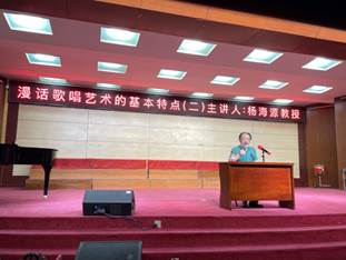 6月9日由音乐学院声乐教研室主办、包头师范学院乌兰牧骑和音乐学院艺术实践中心承办的“漫话歌唱艺术的基本特点”讲座在音乐学院博艺厅举办。我校客座教授、著名男中音歌唱家、声乐教育家杨海源教授为所有师生及社会声乐爱好者进行讲授。