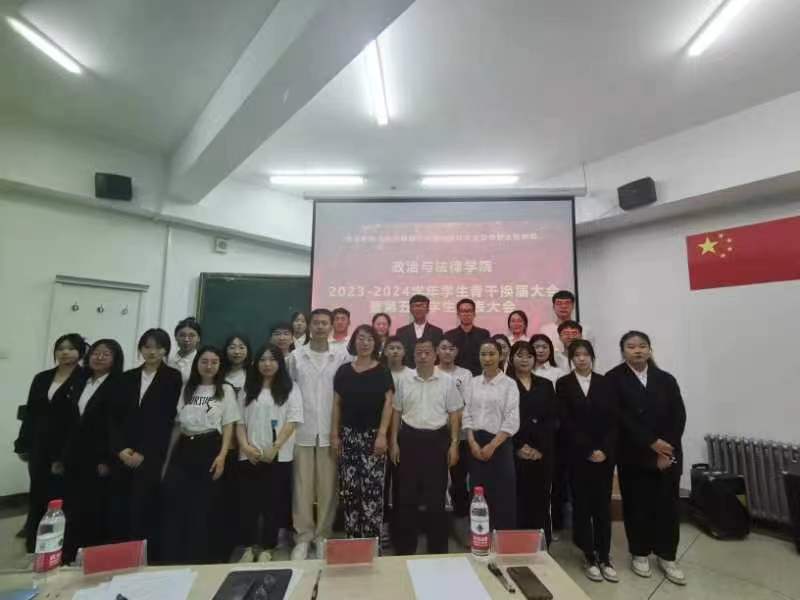 为了调动学生干部工作的积极性,加强学生干部队伍建设,有效促进新学期各项工作顺利开展,6月21日晚上,政法学院在博东506教室召开了2023—2024学年学生骨干换届暨第五届学生代表大会。党总支副书记郭宏升、学工办主任袁爱荣、辅导员白丽、赵鹏然老师出席了会议,团总支学生会所有成员、大一大二各班学生代表参加的会议。