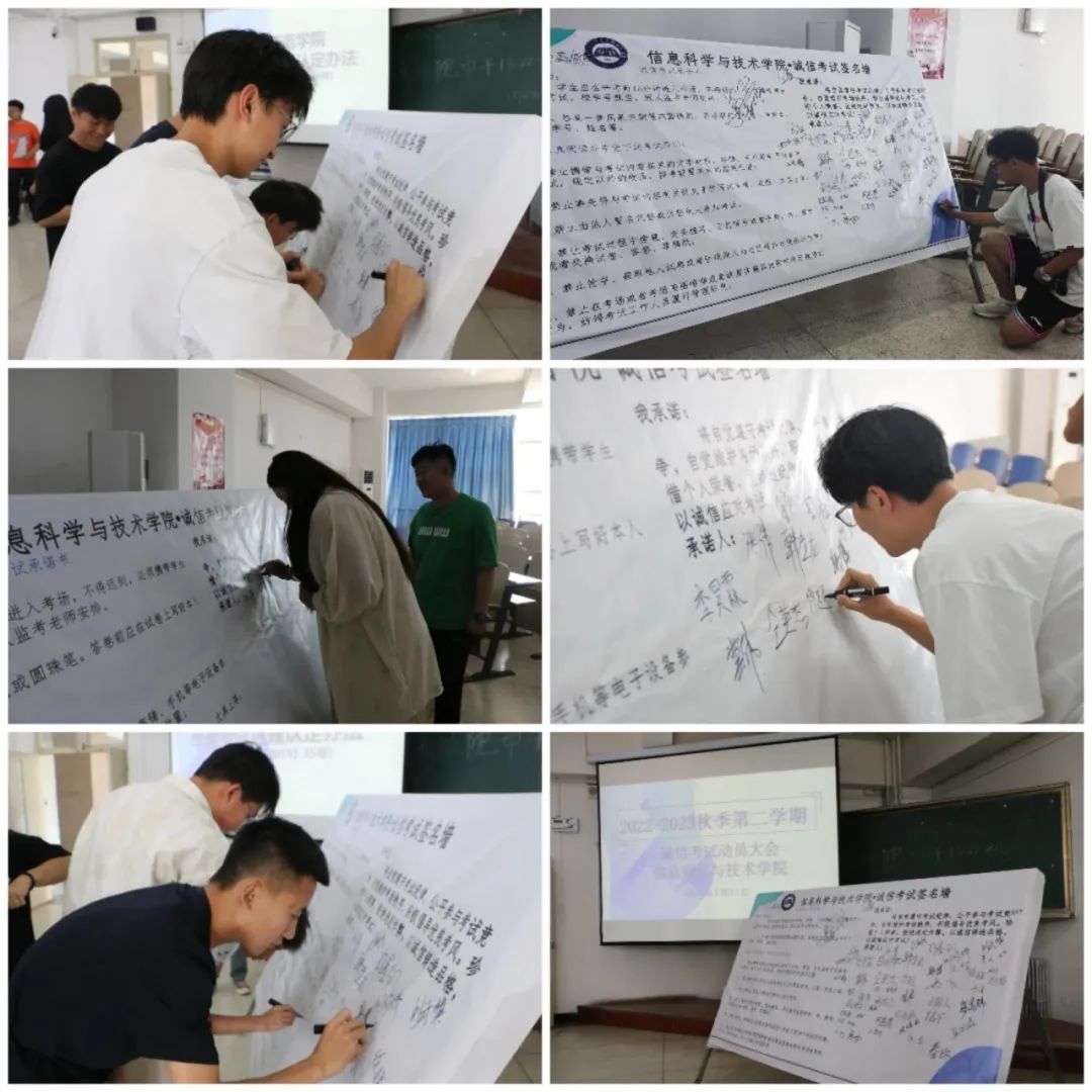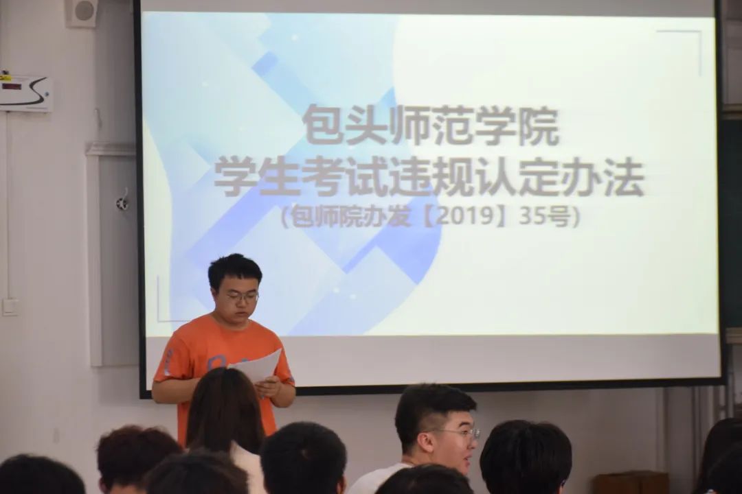 会上,学生干部对《包头师范学院学生手册》第二部分学生日常行为管理-学生考试违规认定办法进行了领学,王老师再次强调了考试违纪的认定和严重性。全体参会学生在诚信考试承诺墙上签字并做出承诺,表示要注重个人品德修养,做一个有担当、有责任心的新时代青年。最后,姜老师提出三点要求,一是各班级每位同学都要高度重视,端正态度,以积极的心态迎接考试;二是班团干部、党员团员都要发挥榜样和表率作用,坚持诚信考试、诚信做人、诚信做事;三是每一位同学都要自信、自立、自强,为建设良好的考风、学风及院风不懈努力。