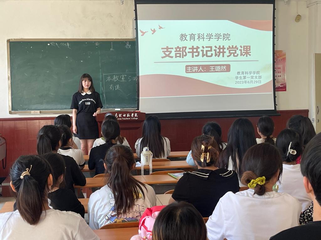 在即将迎来庆祝中国共产党成立102周年之际,为高标准高质量推动学习贯彻习近平新时代中国特色社会主义思想主题教育走深走实,2023年6月29日,教育科学学院学生党支部在博东101开展了“迎七一”支部书记讲党课活动,活动由学生第一支部书记王璐然和学生第二支部书记方丽慧主讲,40余名学生党员参加了此次活动。