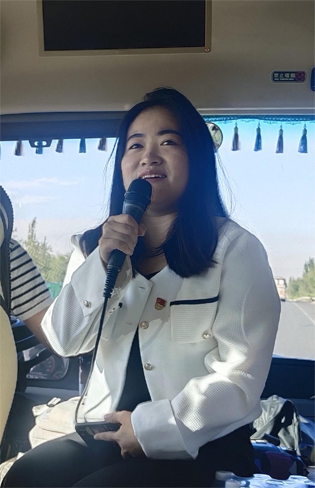 在前往乌梁素海的大巴车上,来自巴彦淖尔市的研究生党员祝乐为大家介绍了近年来巴彦淖尔市关于落实民族政策、促进民族团结所开展的系列活动,并为大家讲述了蒙古族退伍、退休老警察额尔和巴特尔团结邻里的故事,希望大家能在日常生活的细节中促进民族团结。邓明芳也动情地为大家讲述述了“三千孤儿入内蒙”中的巴彦淖尔故事,带大家感受中华民族一家亲的温情。