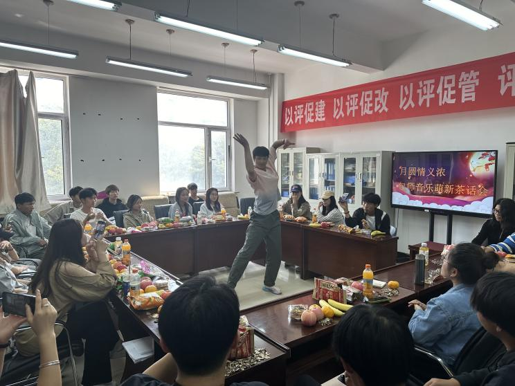 本次活动,结合学生专业特色,在小小的会议室为新生们提供表现自我的舞台。随着热烈的音乐响起,乐起舞动萌新们唱歌、跳舞、吉他演奏等等节目,他们用自己有趣的动作为茶话会营造了轻松愉快的氛围。紧接着老师们也为学生们一展歌喉,更进一步激发了学生的热情,现场喝彩声不断。