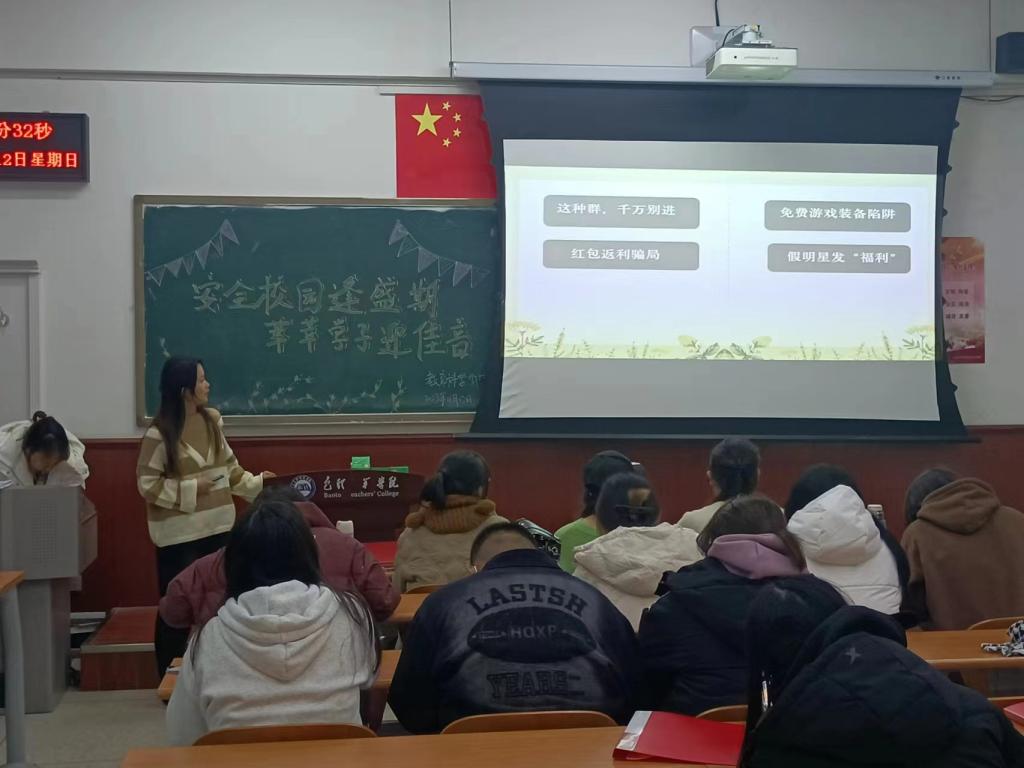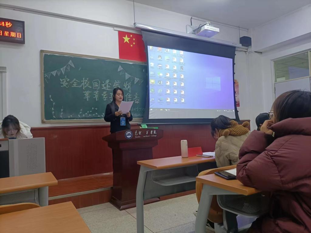 为进一步加强校园安全工作,贯彻执行校园安全教育的各项举措,教育科学学院于11月12日晚在博东103举办了“安全校园迎佳音,莘莘学子提防范”主题演讲活动,目的是提高师生的安全防范意识和自救能力。