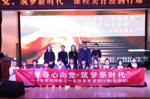 11月17日下午音乐学院走进石拐区第一中学,开展“青春心向党 筑梦新时代”——课程美育浸润行动,学院党总支书记赵玉强、教工一支部书记张少宇和钢琴教研室主任郭淑君及部分师生,为石拐区一中师生带来了一场精彩的钢琴专场音乐会。石拐区第一中学校领导、教师和部分学生200多人聆听了音乐会。