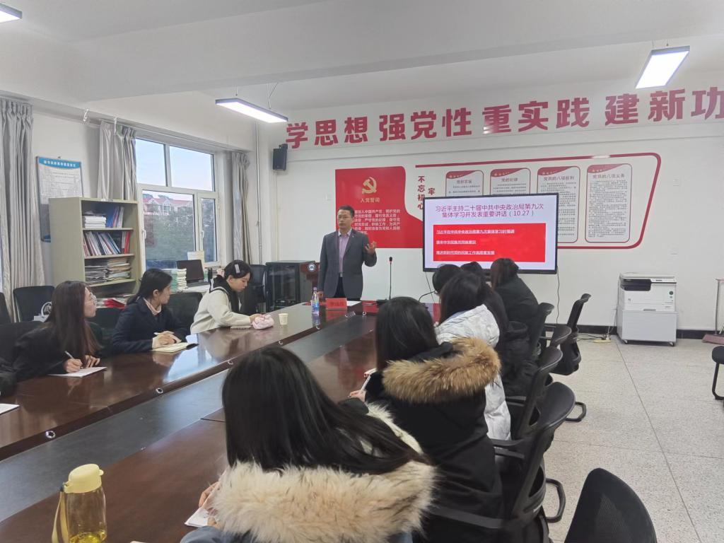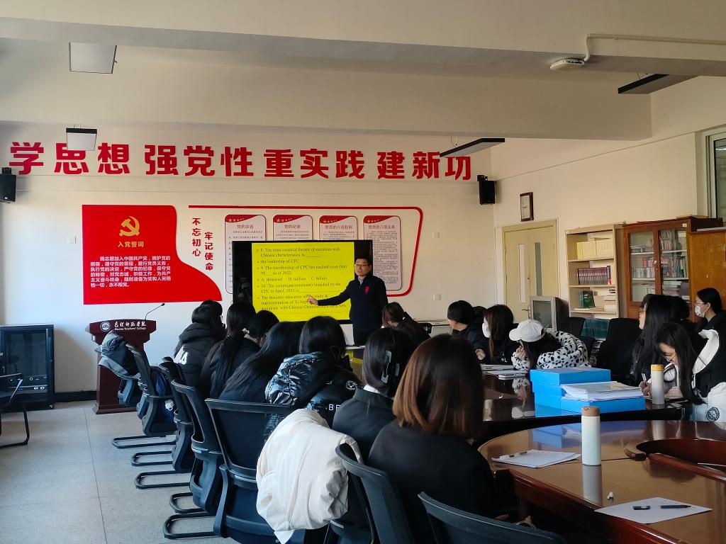 11月11日,学生第一党支部书记张宝龙老师结合英语专业,讲授了题为《Strive to Be an OutstandingStudent Cadre, and Set an Example Excellent in Both Character and Studies》的专题讲座。张老师用英文向大家讲解了党的基本性质、党的宗旨,党的基本路线、我国基本政策和基本纲领以及共产党员的基本义务、权力和申请入党的基本条件。他勉励在座的青年学生争做优秀学生干部,发挥先锋模范带头作用,做品学兼优的表率。
