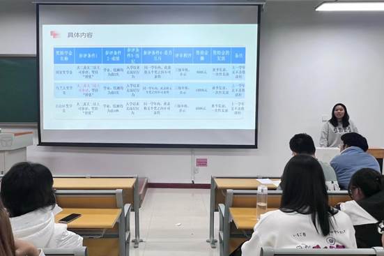 三位同学向大家介绍了奖助学金的参评条件和资助金额。2020级会计班张梓荣鼓励大家要积极参与学校及学院组织的活动,锻炼实践能力;同时向同学们强调课堂学习、整理笔记和及时复习的重要性。最后通过自己学习、工作的感悟来激励同学们更好的克服困难,积极进取。