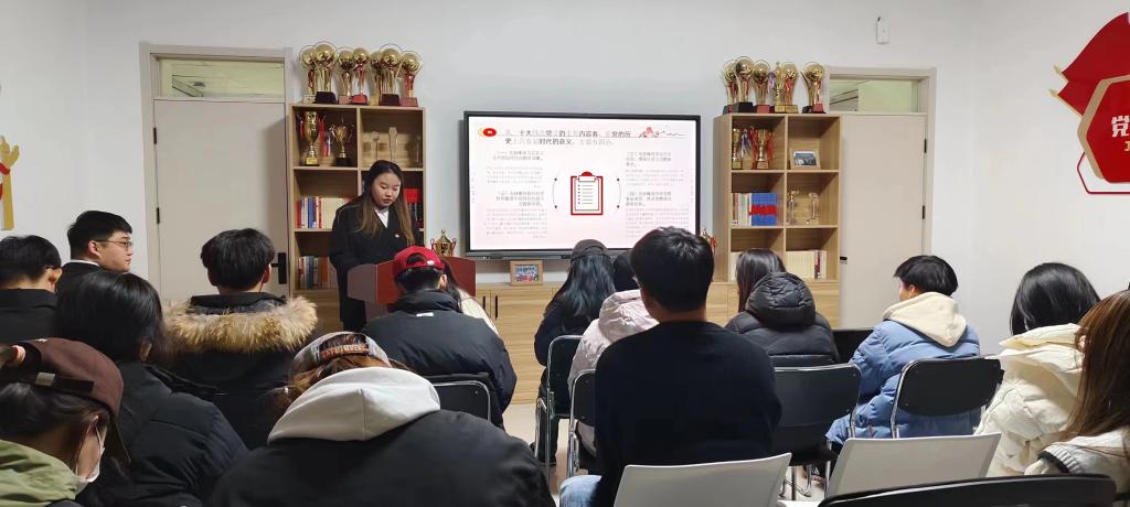 活动伊始,郭宏升介绍了开展此次活动的目的、意义,指出在党员教育方面不仅要发挥教师的教育引导作用,还要发挥学生党员的先锋模范作用。接着由两位优秀学生党员徐嘉蔓同志和许文龙同志为同学们介绍党的章程与二十大精神的相关知识。徐嘉蔓同志从《党章》的修改入手,准确把握《党章》的内容、充分理解《党章》的意义,增进了同学们对党的政治认同、思想认同、理论认同、情感认同。许文龙同志则引领同学们回顾党的二十大精神,聚焦“五大任务”,使同学们深入感悟习近平新时代中国特色社会主义思想的深刻内涵,激励同学们将个人理想、个人规划、个人奋斗与国家的发展紧密联系起来。