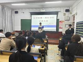 在比赛中,来自全院20名余名宣讲员利用宣讲PPT以图文并茂的方式,向在场同学们普及勤俭节约相关知识,并结合社会热点及自身生活经历,向同学们分享节约案例、传递节约理念,倡导大家从点滴做起、从自身做起,以实际行动践行勤俭节约,拒绝浪费的传统美德。经过激烈的角逐,本次比赛最终评选出了前3名选手。荣获前三名的选手依次为朱钉钉、张健楠、吴银娜。