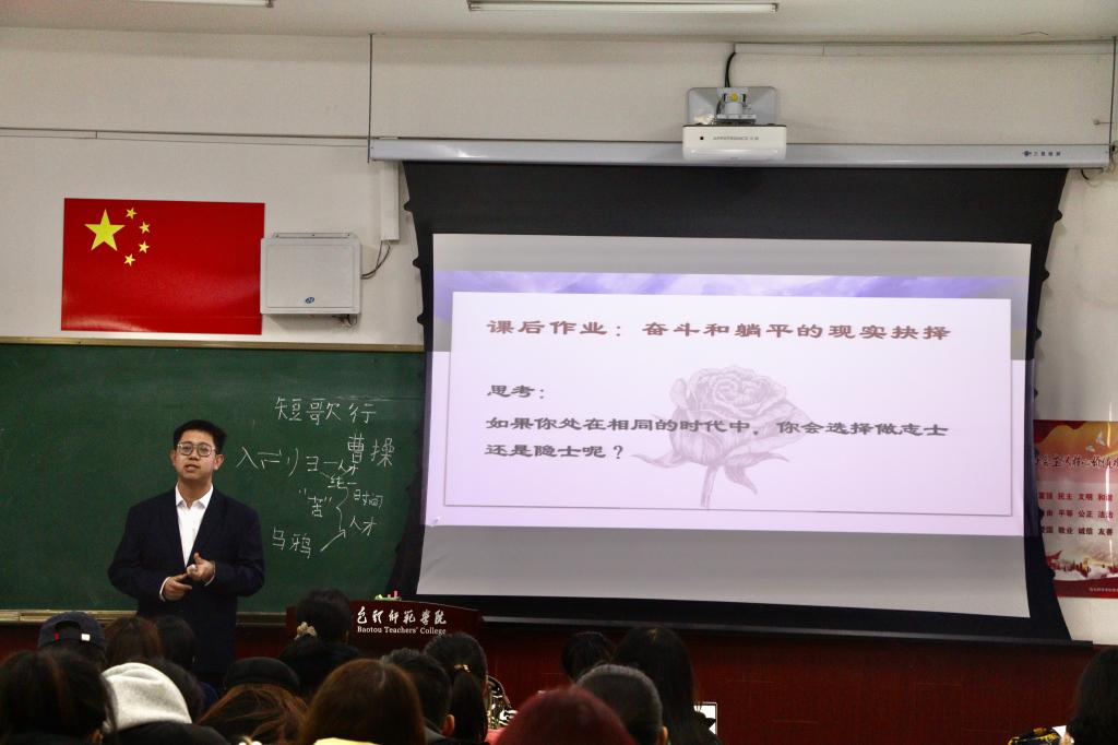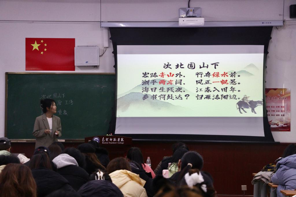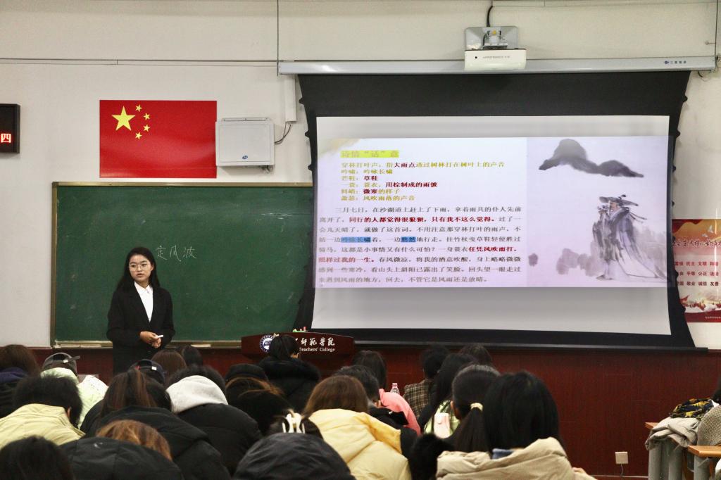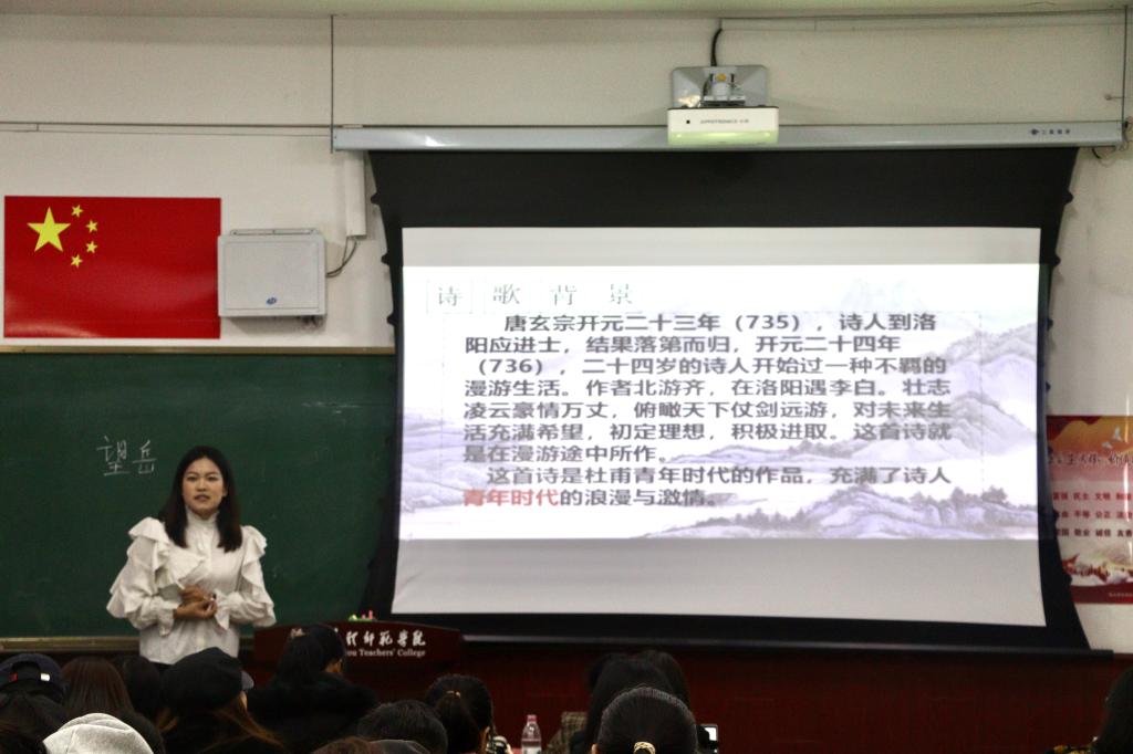 诗词中蕴含着中华民族的家国情怀、道德品质和艺术魅力。比赛现场,参赛选手们用生动形象的语言,从时代背景、诗人简介、诗意赏析、启示升华中将观众带入诗词的殿堂,让大家深刻体会诗词之美,诠释了经典诗词的现代意义,陶冶了情操,升华了思想。“明月出天山,苍茫云海间。” “谁怕?一蓑烟雨任平生。”“周公吐哺,天下归心。”……耳熟能详的古诗在选手们的口中呈现出不同的风格和别样的韵味。决赛最后,赵彩娟老师对参赛选手们的表现进行了点评,着重提出了内容要新颖、形式要多样、品读要精准、思路要开阔、板书布局要规整等建议。