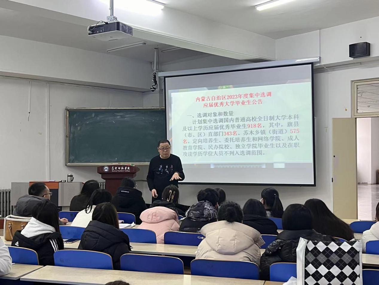 为助力毕业生高质量就业,12月14日,马克思主义学院举办内蒙古事业单位招聘考前辅导讲座。讲座由马克思主义学院郭志峰老师主讲。