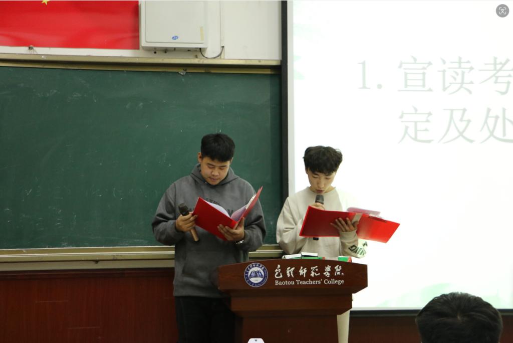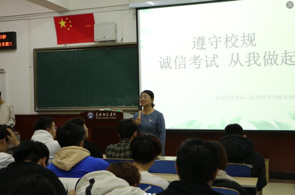 会上,学生骨干代表领学了《包头师范学院学生手册》第二部分学生日常行为管理-学生考试违规认定办法,全体参会学生观看了考试违纪处分案例,全体参会学生共同宣读了诚信考试个人承诺书,并在诚信考试电子签名墙上签字,承诺“要自觉遵守考试纪律,公平参与考试,自觉维护考场秩序,积极倡导优良考风,珍惜个人荣誉,拒绝违纪作弊”。学生党员同时签写了“领任务、亮身份、做贡献”承诺书。最后,姜老师强调了考试违纪行为的严重后果,并且通过生动形象的示例引导同学们认识“诚信”这一优良品德的重要性,提出三点要求,一是各班级每位同学要高度重视,端正态度,以积极的心态迎接考试;二是班团干部、党团员要发挥榜样和表率作用,影响周围同学;三是每一位同学要自信、自立、自强,为建设良好的考风、学风和院风不懈努力。