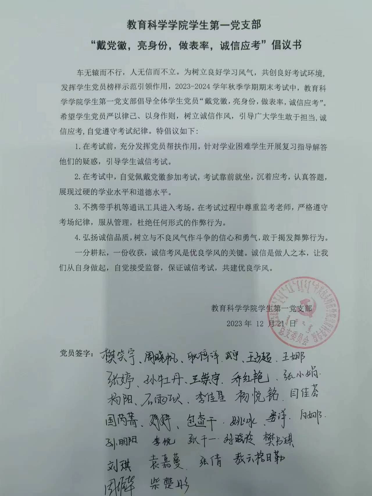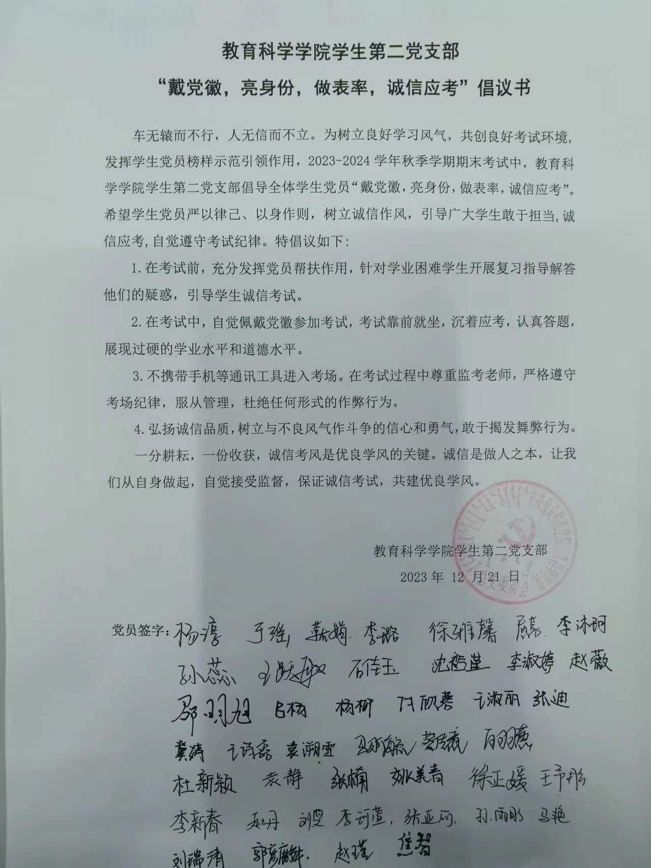 学校期末考试,不仅是检验专业知识掌握情况的考试,更是一场道德品质的考试,直接关系着每位同学诚信处事、以诚待人的品德。为发挥党员先锋模范作用,12月21日晚7点,我院学生支部开展“诚信考试,从党员做起”活动,一支部和二支部党员代表杨悦铭和王跃敏分别领读“戴党徽 亮身份 做表率 诚信应考”倡议书,与会全体学生党员共同签字承诺:考试期间佩戴党徽进入考场,严格遵守考试的规定和守则,自觉接受监考老师和同学的监督。