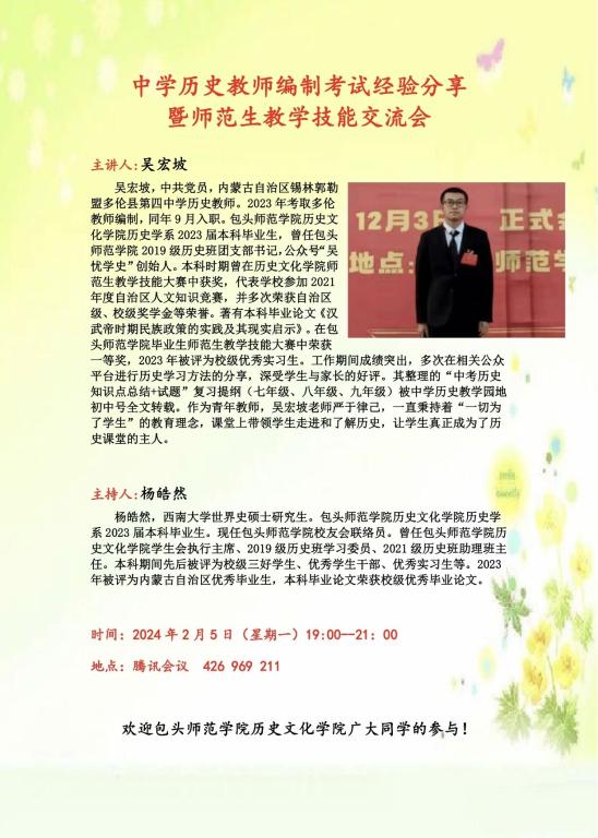 为增强历史文化学院全体同学的就业意识,推进我院学生高质量就业,提高历史师范教学技能,解答同学们在教师编制考试中遇到的问题,历史文化学院特邀请我院优秀校友,现就职于内蒙古锡林郭勒盟多伦县第四中学历史教师吴宏坡,于2024年2月5日以视频形式,为我院历史学专业学生开展了以“内蒙古教师编制考试经验分享”为主题的线上讲座。讲座由我院优秀校友,西南大学世界史在读研究生杨皓然主持。