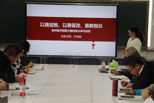 尹淑娟老师结合自身20年从教经验以及2023年第三届全国教师教学创新大赛的参赛经验,从教师教学创新大赛要求、评分标准、创新报告撰写、创新教学设计与方法、课堂实录、现场答辩等方面做了经验分享和现场演示,并着重分析了比赛的评价维度和关键点。现场,老师们就高校教师相关教学技能竞赛以及日常教学中的困惑和问题与尹老师进行了研讨交流。