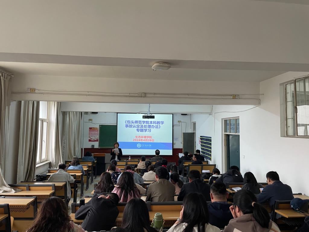 2024年4月28日下午,在齐志楼401教室,生态环境学院召开专题会议组织全体教师共同学习《包头师范学院本科教学事故认定及处理办法(修订)》(包师院办发【2023】17号)。