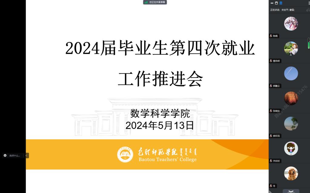 为扎实推进2024届毕业生高质量充分就业,明确近期就业工作重点,抓住毕业生本周集体返校参加毕业论文答辩的好时机,5月13日晚,数学科学学院通过线上会议方式召开2024届毕业生第四次就业工作推进会,会议由党总支书记姜雪主持,学院全体教师参会。