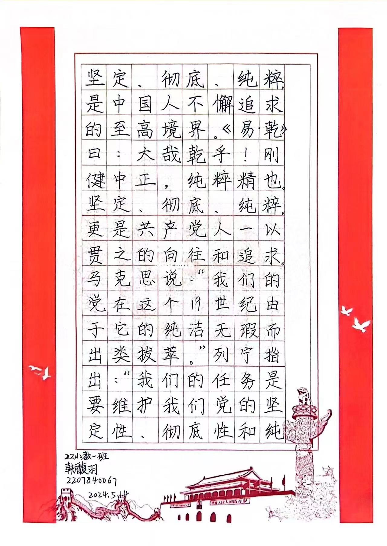 钢笔字打卡活动。5月10日-14日,学生会素质教育拓展部举办“中国梦·民族情”主题钢笔字五日打卡活动,共收到了114份优秀的书法作品。活动选材范围主要围绕摘抄党的二十大报告和二十届二中全会重要论述、金句,同学们的作品飘若浮云,矫若蛟龙,或劲键,或婉转,饱含着同学们挥斥方遒的激情,以笔墨为媒,以纸张为介,每一个汉字都体现着同学们的书法功底,一笔一画写出中国青年的自信,用硬笔书法书写出对“中国梦”的理解与感悟。