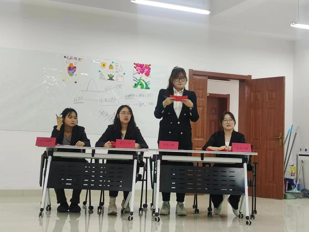 决赛延续初赛赛制,以班级为单位,共分为三组,分别就“爱是自私还是无私”、“AI可能会取代教师吗”以及“躺平与竞争:当代青年的选择”三个议题展开了激烈的辩论。辩论赛由立论陈词、攻辩环节、攻辩小结、自由辩论、总结陈词和评委点评六个环节组成。在辩论过程中,同学们思维敏捷,各抒己见,气氛高涨,辩手们的逻辑推理严谨,掷地有声。经过激烈的角逐,22学前二班最终荣获冠军,22学前一班和23小教三班并列亚军,23小教一班、23小教二班和23学前一班并列季军。
