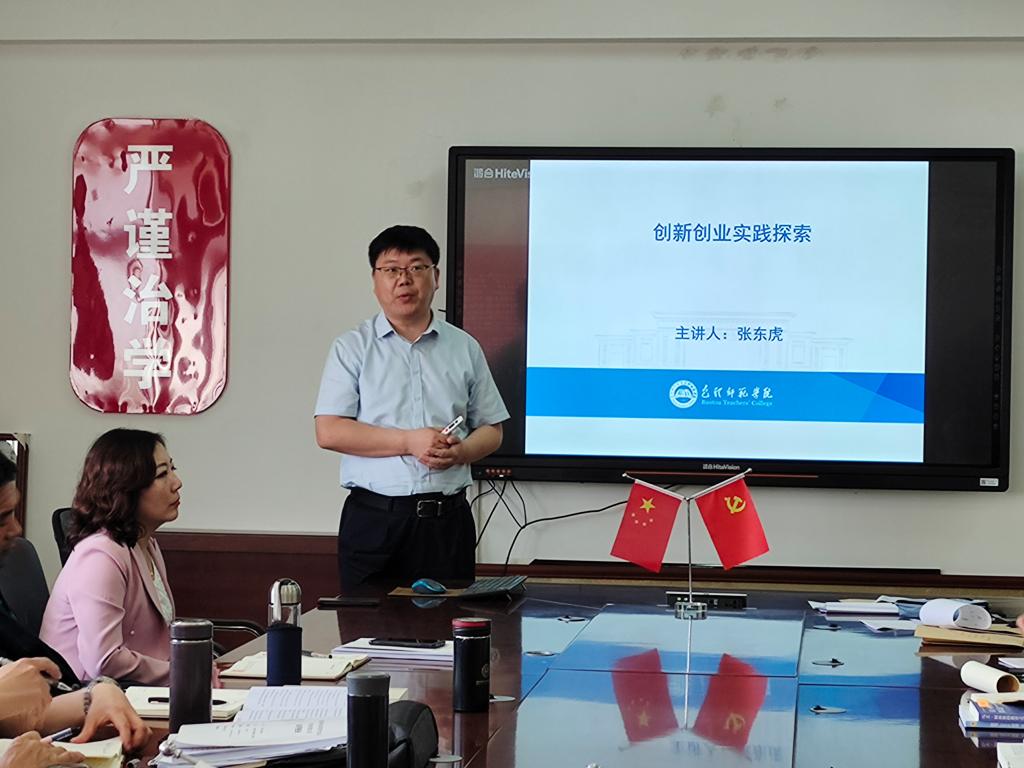 培训会的第一阶段由张东虎院长以《创新创业实践探索》为题,详细介绍了学校创新创业工作,高校双创教育面临的形势与任务,创新创业“五位一体”教育模式以及“五位一体”创新创业取得的成效。张东虎院长提出了创新创业教育要实现两个突破:一是实现从就业从业教育到创新创业教育的突破,以创新引领创业,以创业带动就业,实现我校更高的创新创业的局面;二是实现创新创业人才培养机制的突破,通过创新创业教育,打破学科专业的壁垒,实现多学科交叉融合、跨学科学习、校内外协同的综合效应。张院长还特别针对数学科学学院如何做到专创融合和思创融合进行了详细分析,细致指导学院要通过联系优秀校友项目、教师申报创新创业课题挖掘项目、专业发展建设、实验室科研项目开展、校企合作项目和过往比赛优质项目持续打磨等途径参赛备赛,实现好的竞赛成绩。