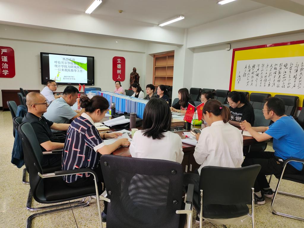 为切实推进数学与应用数学专业师范认证工作的有序开展,6月9日,数学科学学院邀请呼伦贝尔学院数学与统计学院万阿英院长一行3人到数学科学学院指导师范专业认证工作。数学科学学院院长赵国忠、党总支书记朱丽、教学副院长徐国明以及学院师范专业认证工作组组长及全体成员参加了此次会议。