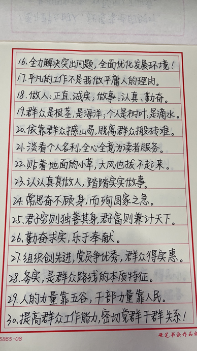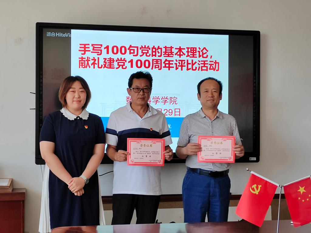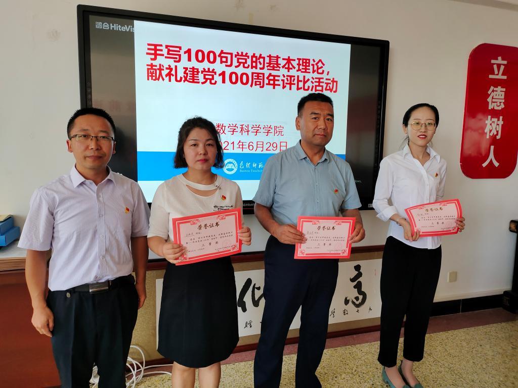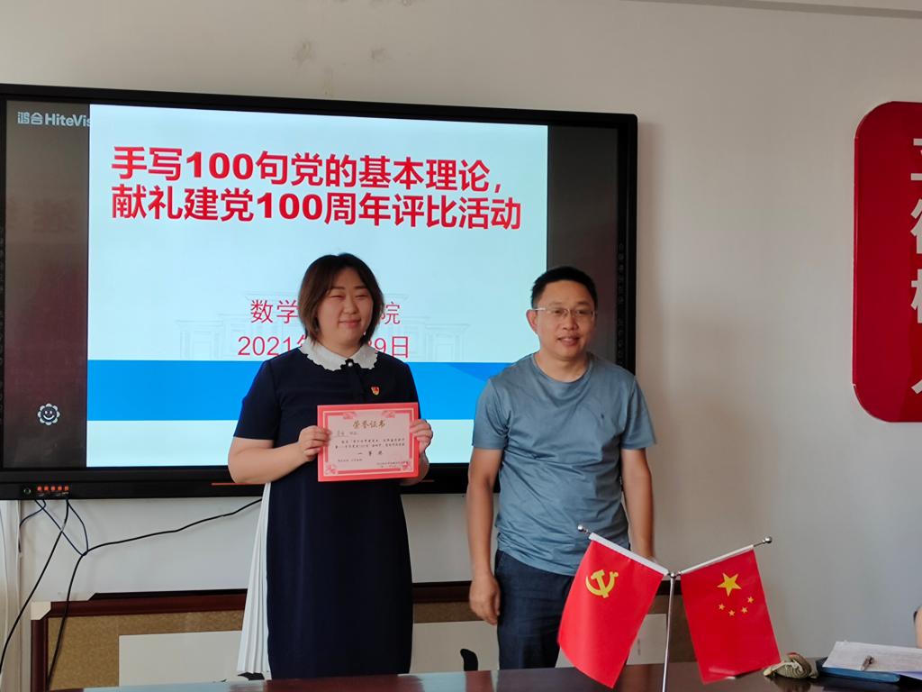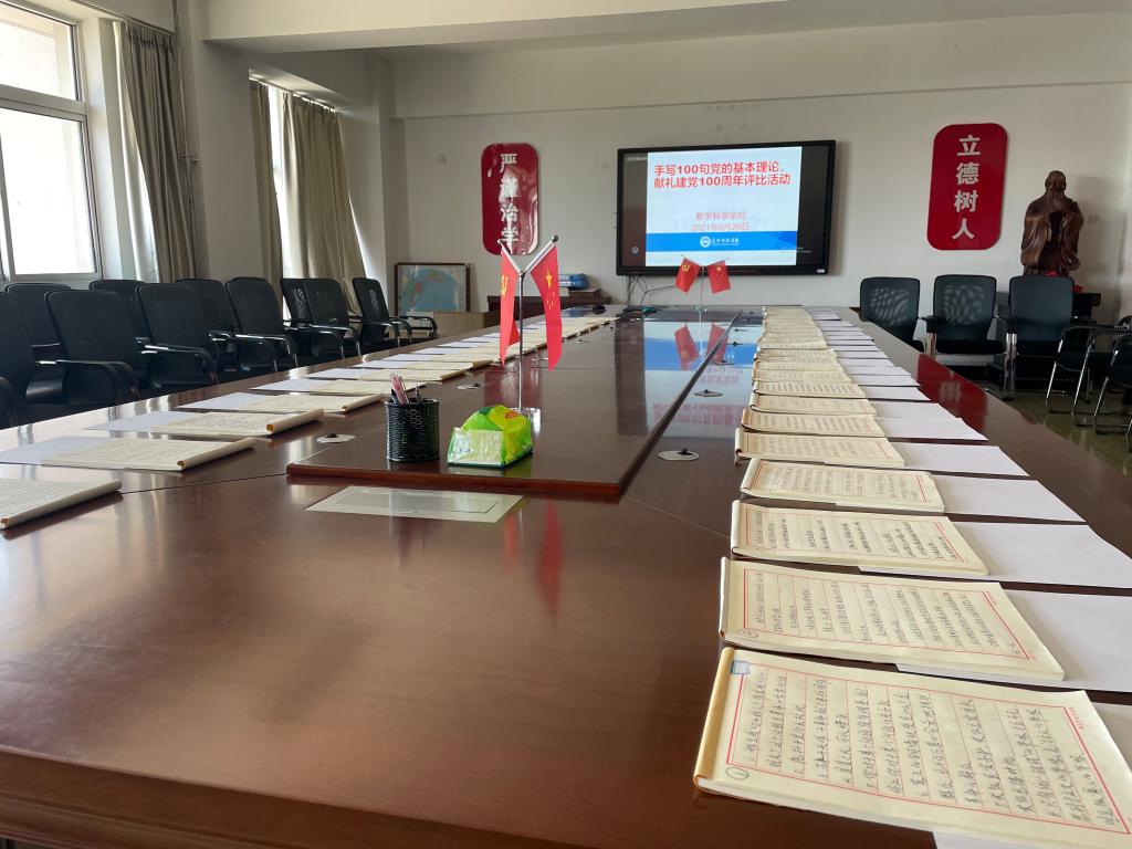 为庆祝伟大的中国共产党百年华诞,歌颂党100年来走过的光荣历程和丰功伟绩,深入学习贯彻习近平总书记在党史学习教育动员大会上的重要讲话精神:“用党的奋斗历程和伟大成就鼓舞斗志、明确方向,用党的光荣传统和优良作风坚定信念、凝聚力量,用党的实践创造和历史经验启迪智慧、砥砺品格”,推动党史学习教育走深走实,在“七一”党的百年华诞来临之际,数学科学学院隆重举办全体教师和全体学生党员“手写100句党的基本理论,献礼建党100周年”评奖活动,抒发全体师生对党的热爱和敬仰之情。