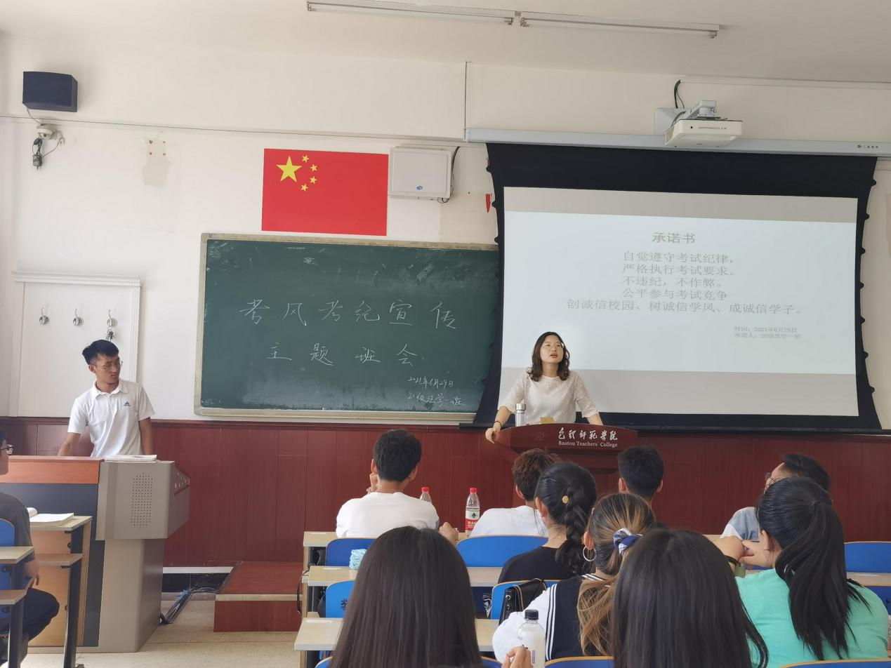 本次活动,20法学一班认真学习了学生手册中《包头师范学院学生考试违纪行为认定规定》和《包头师范学院学生违纪处分管理规定》,同学们认识到了考试违纪的严重危害和不良后果,纷纷表示要诚信考试,以优异成绩迎接建党百年。(政治与法律学院)