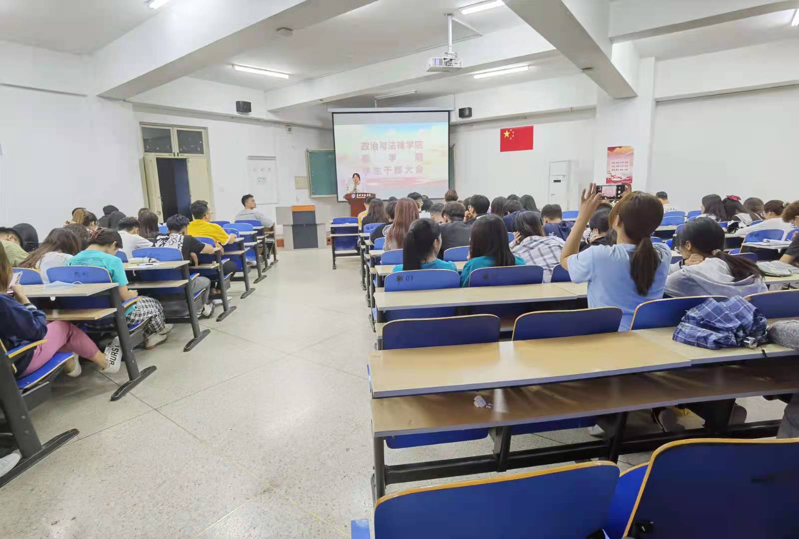 为进一步加强学生干部队伍建设,推进新学期工作平稳有序进行,充分调动学生干部自我管理的积极性,8月30日晚上,政法学院在博学楼606教室召开了新学期学生干部大会暨迎新工作动员会,出席本次会议的有学院副书记郭宏升、学工办主任袁爱荣、辅导员王晓庭、秦乐、王健、白丽,全体学生干部、大二到大四各班班长、团支部书记、学习、宣传、生活、心理委员参加了会议。会议由学生会主席王洋主持。