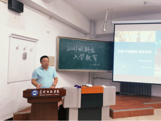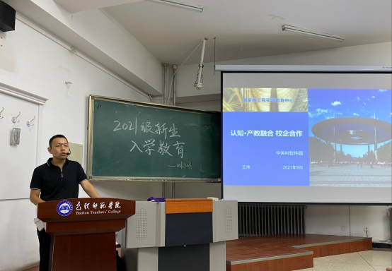 为了推进产教融合、校企合作,加强校企合作学生教育管理,物理科学与技术学院、信息科学与技术学院于9月23日晚在博学楼东104联合举办了2021级新生入学教育专题讲座。学院特邀请中关村软件园人才基地培训中心华北区负责人王伟老师担任本次讲座的主讲人。培训中心校企合作总监李建国老师、专业讲师卢秀荣老师、驻校班主任赵雨薇老师、我校微电子科学与工程专业系主任李慧慧老师、信息学院学工办主任姜嘉丽老师出席活动。