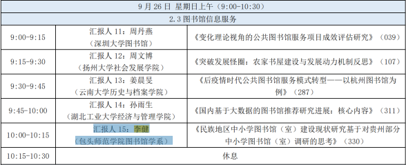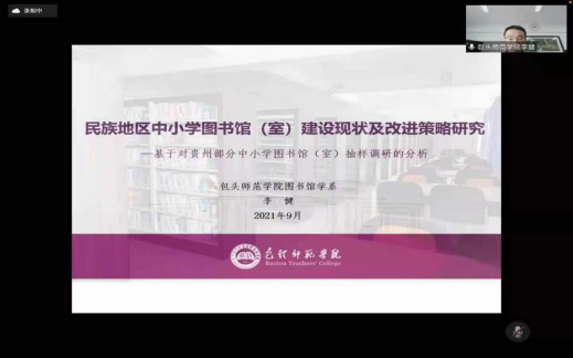 9月25-26日我校图书馆学专业师生参加了由北京大学信息管理系和图情档39青年学者沙龙主办的2021图书情报与档案管理研究生教育论坛暨青年学者论坛、第十四届全国图书馆学博士生论坛,论坛采用线上为主、线上和线下结合的方式。我院图书馆学系李健老师在分论坛上做了题为《民族地区中小学图书馆(室)建设现状及改进策略研究—基于对贵州部分中小学图书馆(室)抽样调研的分析》的会议报告,该报告议题属于教育部人文社科研究青年基金项目“铸牢中华民族共同体意识背景下的西部民族地区中小学图书馆建设研究”阶段性研究成果之一。会议主持人东北师范大学信息科学与技术学院张文亮副教授和西北大学公共管理学院王铮副教授对本选题进行了高度评价,一致认为具有研究价值,尤其对促进中小学图书馆事业的发展。我系还组织了部分图书馆学学生参与线上聆听,本次会议的圆满结束,极大促进了我系教师与学界最新研究理论的融合,也充分体现了我系在图书馆学人才培养方面的理论自信和专业自信。
