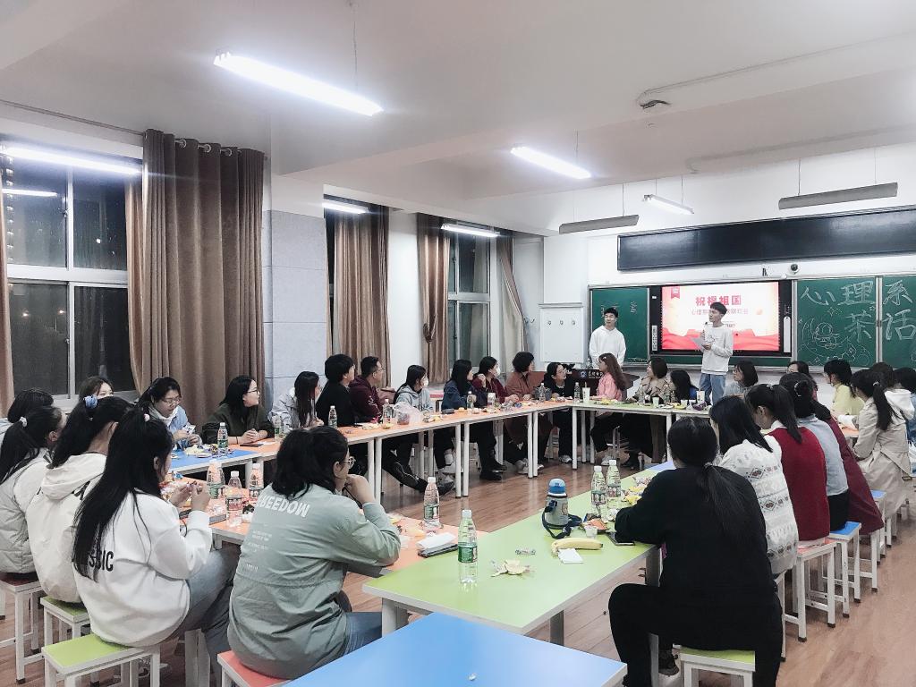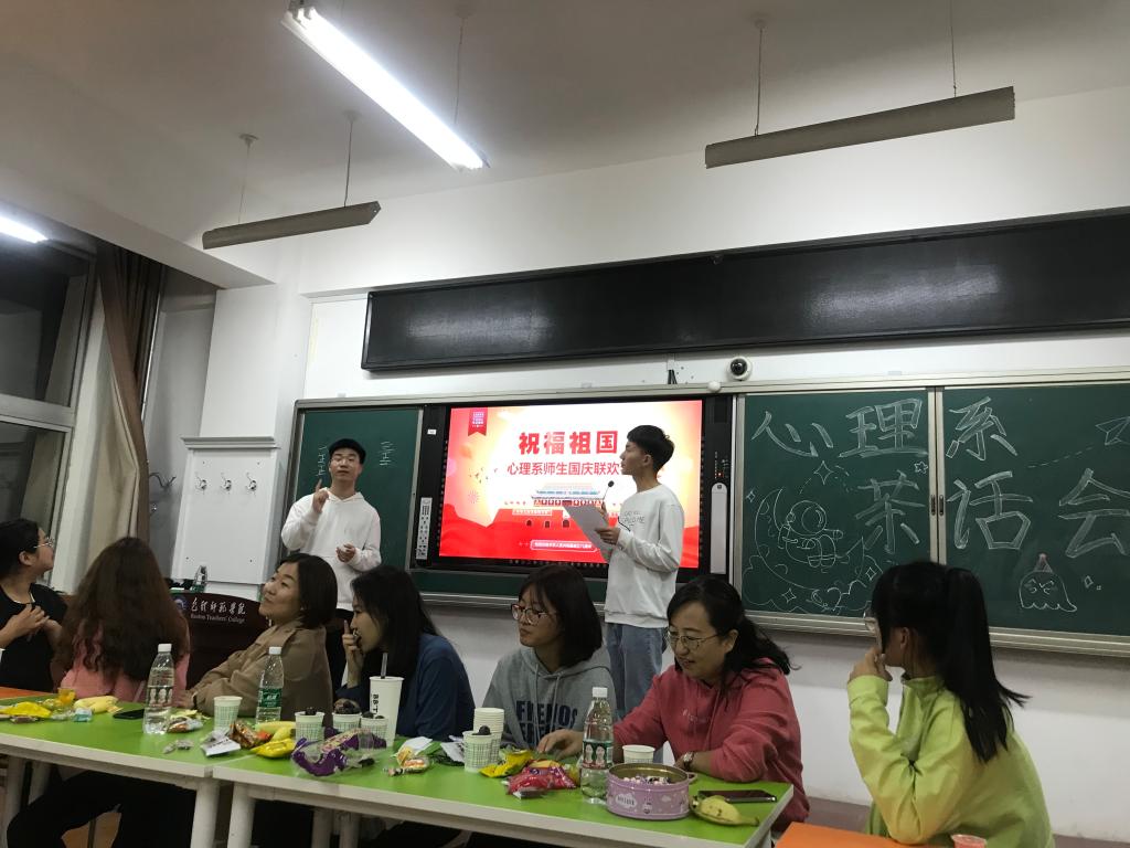 伴随着金秋明媚的阳光,迎着十月的秋高气爽,我们迎来了中华人民共和国七十二岁华诞。教育科学学院应用心理系于10月6日晚,举办了“祝福祖国——师生国庆联欢会”。本次活动由心理系各班班委组织,教育科学学院副院长刘俊英、心理系教学系主任李志强、心理系实践系主任朱利娜、心理系教师闫丽萍、渠二平、何美娜、韩萨日娜老师及心理系国庆假期留校生参加了本次活动。