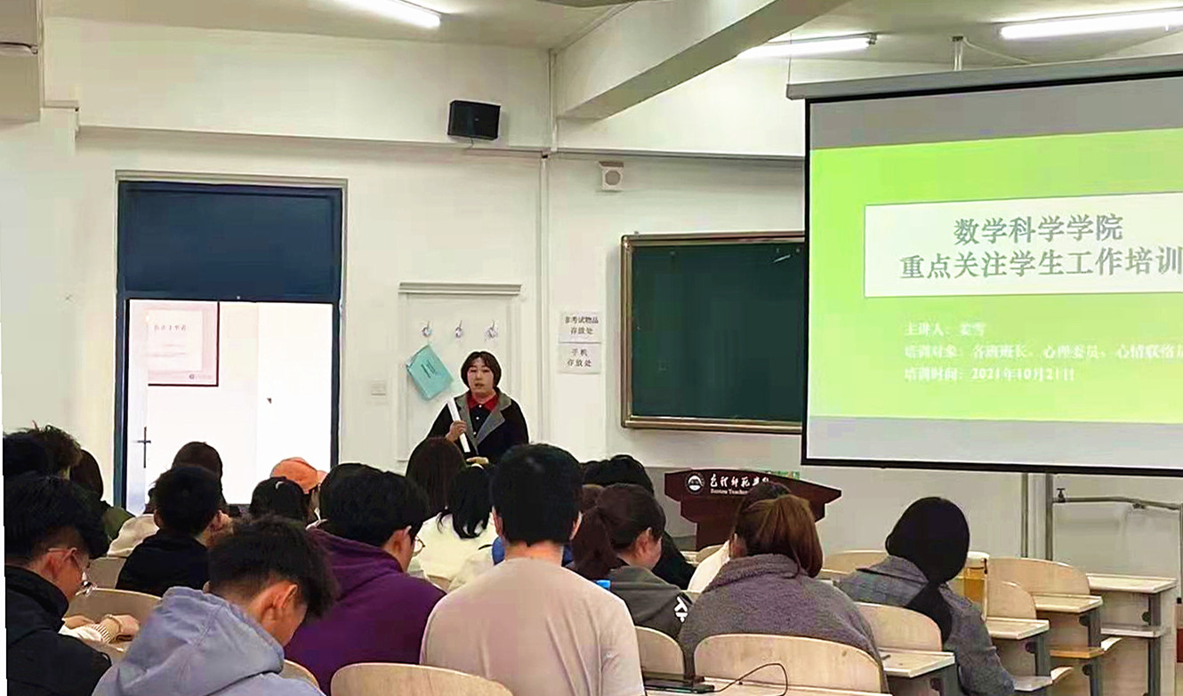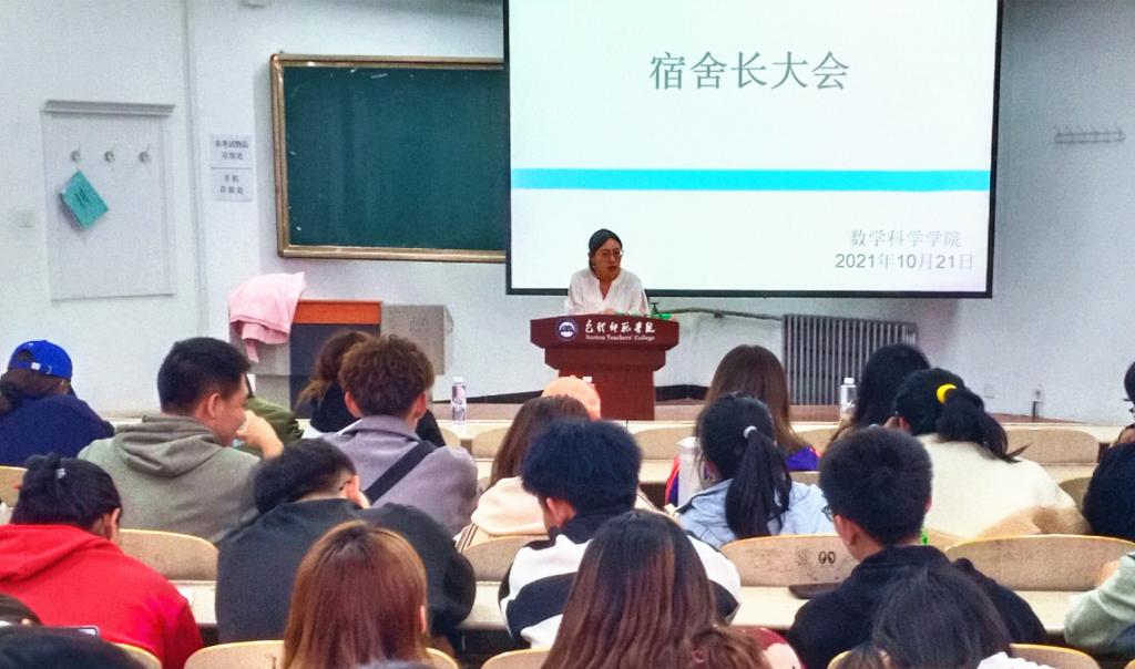 首先,刘晶对舍风建设的具体要求做了部署,重点强调宿舍文明习惯的养成、宿舍学术氛围的营造和冬季传染病预防。之后,陈娟讲解了数学科学学院“10.10”心理健康教育活动月的具体安排,并对各项工作的目的意义和工作方式进行了说明。最后,姜雪做了重点关注学生工作培训,明确了心理委员、心情联络员的角色定位和工作职责,对六类、30种需要重点关注的内容和关注方法做了详细讲解,并强调了宿舍在思想政治教育工作,尤其是学风建设和护航学生健康成长方面的基础性、关键性作用,对班长在班级工作中统筹作用的发挥和心理委员、心情联络员在班级成员发展上综合性作用的发挥提出较高期许。