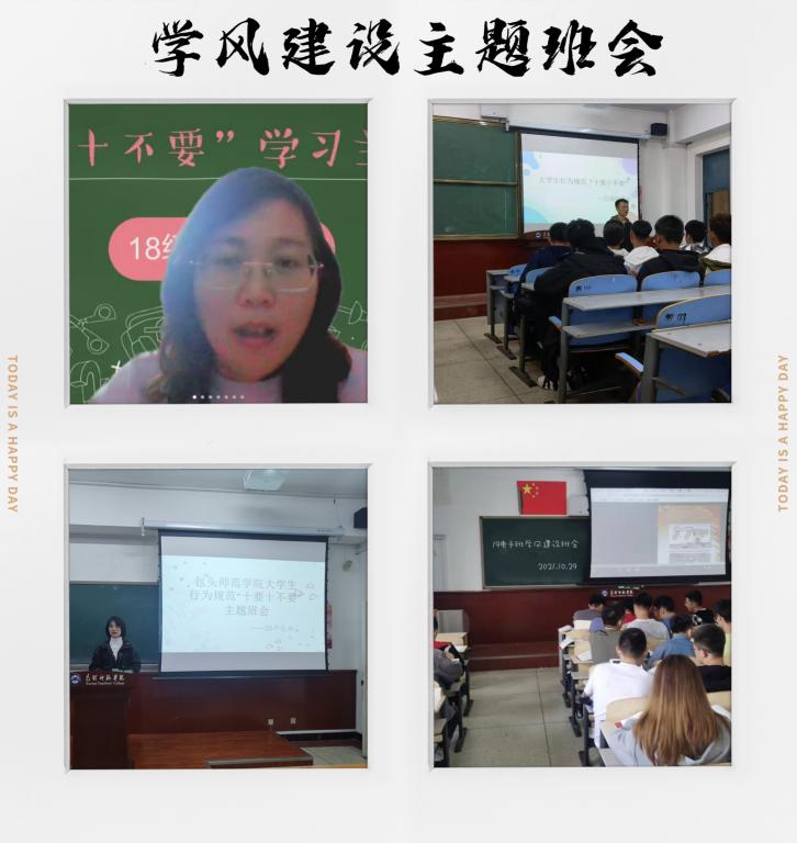 10月26日,召开学院学工办例会,传达部署学校“学风建设工作推进会”精神,结合学校《关于进一步加强学风建设工作的实施方案》和《包头师范学院大学生行为规范“十要十不要”》相关内容,重新修改完善了《信息学院“优良学风班级”量化考核细则》和《学生生活社区检查管理办法(试行)》,对各班级学习落实“十要十不要”工作进行了布置。26日开始,各班召开班会,创新形式组织学习大学生行为规范“十要十不要”相关内容,21级新生班班主任组织学生集体朗读“十要十不要”并将其作为每天晨读的必须内容;学院及时将大学生行为规范“十要十不要”宣传标语上墙,并通过学院官微、工作群等媒介大力宣传推广。10月28日,召开全体教职工大会,学院党总支书记和院长分别从教职工管理和教学方面对学院学风建设工作进行了再要求、再部署。之后,召开了班主任工作月例会,解读学校学风建设工作方案,对各班推进学习“十要十不要”提出明确要求,要落地见效,避免流于形式。希望班主任老师能够高度重视班级学风建设,常抓不懈,久久为功。