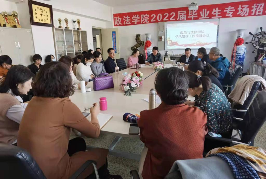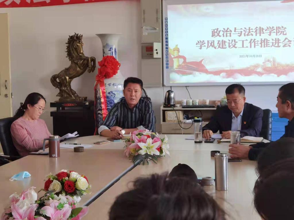 会上,李霞副院长强调了学风建设在学院教育教学管理中的重要性,并安排部署了学院当前教学管理相关主要工作内容,要求全体教职工高度重视学风建设,积极参与。接着,高德胜书记强调疫情期间学院学风建设的长期性和困难性,提出学风建设要注意方式方法,规范学生课堂参与的程度以及学生日常应有的行为习惯养成的培养,全体教职工要高度重视学风建设的实效性。最后,郭宏升副书记宣读了我校《关于进一步加强学风建设工作的实施方案》和《包头师范学院大学生行为规范“十要十不要”》,传达了金桩校长、格根哈斯副校长在我校学风建设推进会上的讲话精神,指出了政法学院在学风建设方面存在的问题,宣布了结合政法学院实际出台的学风建设实施方案,细化了工作任务和人员安排。会后,学院各班通过各种方式召开了“十要十不要”学风建设主题班会。